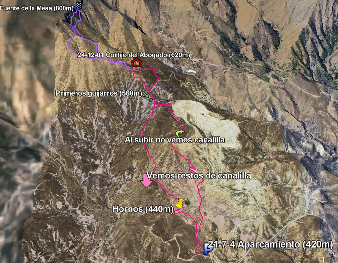 Después de bastantes aplazamientos por diversos motivos para continuar buscando el trazado de la canalilla, por fin pudimos continuarla el 1 de diciembre de 2024, justo 3 años y 4 meses después de la anterior búsqueda. Ahora se partía desde el cortijo del Abogado y se finalizaba en la fuente de la Mesa. Descubrir por dónde pasaba la canalilla era lo que pretendíamos saber.