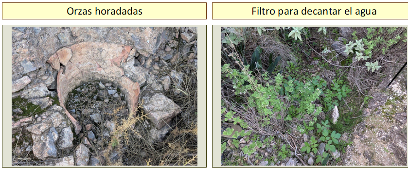 Todos coincidimos en pensar que la obra se hizo de arriba a abajo, para aprovechar lo más importante, el agua, que junto a los materiales propios de la zona permitió minimizar los costes y rebajar los tiempos de construcción. Lo que más nos sorprendió fue encontrar, cuando faltaba poco para la fuente, dos orzas horadadas por donde se insertaban las canalillas. Ahí no hubo unanimidad para interpretarlas: unos pensaron que podía servir para suavizar la presión del agua eliminando aire, mientras otros vieron que la existencia de las orzas era para acceder con más facilidad al agua. También sorprendió una especie de filtro rústico para decantar agua practicado a ras del suelo, muy difícil de identificar salvo para los ojos más acostumbrados.