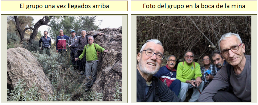 Nada más llegar a la zona de la boca de la mina, Sebastián, Juanjo y Esteban, los más hábiles en el uso de las herramientas de podar, comenzaron a quitar maleza sin descanso, mientras que los demás observábamos atónitos a los que trabajaban con maña y rapidez. Por fin, tras un generoso rato de trabajo despejando la entrada, pudimos hacer la esperada foto entre un alboroto de alegría, que hubiera sido imposible si no se hubieran subido unas herramientas que en un principio no supimos para que iban a servir.
