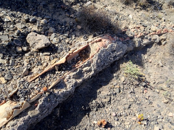 En esta nueva ocasión quiso acompañados nuestro amigo Juan Leiva, gran conocedor de esta sierra y que estaba especialmente interesado en saber que había de cierto sobre el hecho de que el agua que utilizaban en el complejo minero la traían desde la fuente de la “Mesa Contrata” a través de unos rústicos canales hechos de arcilla cocida, salvando numerosos desniveles de la accidentada orografía de la sierra de Gádor. Juan Leiva nos decía que había encontrado algunos restos de la canalilla que le evidenciaban que su existencia era una realidad.
