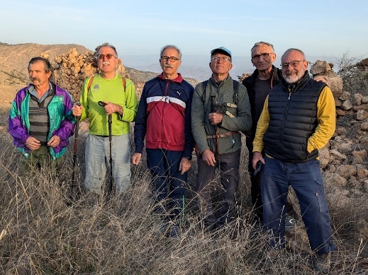 La falta de veredas no fue problema para Juanjo y Esteban que, acostumbrados a andar por la agreste sierra de Gádor, se alejaron poco a poco de los demás que nos costaba bastante andar por la accidentada maleza. Así fue, hasta que por fin llegamos al camino de bajada de la Mesa, entonces sí que se pudo acelerar la marcha. En poco tiempo bajamos hasta el Cortijo del Abogado donde nos esperaba Juan Leiva con su todoterreno. Y ya, todos juntos, pletóricos de satisfacción, regresamos a Alhama.